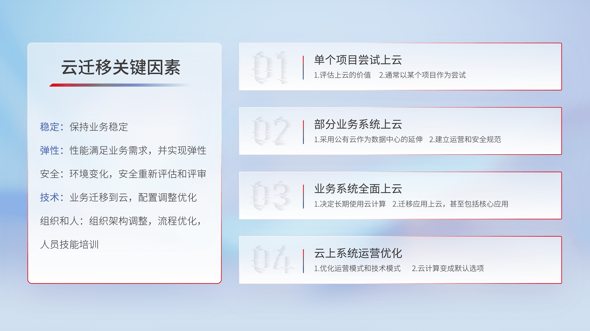 结合实际业务,,,,从规划设计、、、云平台选型、、、云原生改造、、数据迁移、、、集成交付,,迁移全过程为客户识别最佳上云路径,,做好风险识别管理,,,,设计网络架构、、、身份权限、、安全审计合规、、操作审计、、、、日志审计、、、监控告警策略、、多站点容灾设计等,,对云上基础设施进行整体规划,,,,提升IT治理水平,,以满足弹性、、、高可用、、高性能的需求。。。。