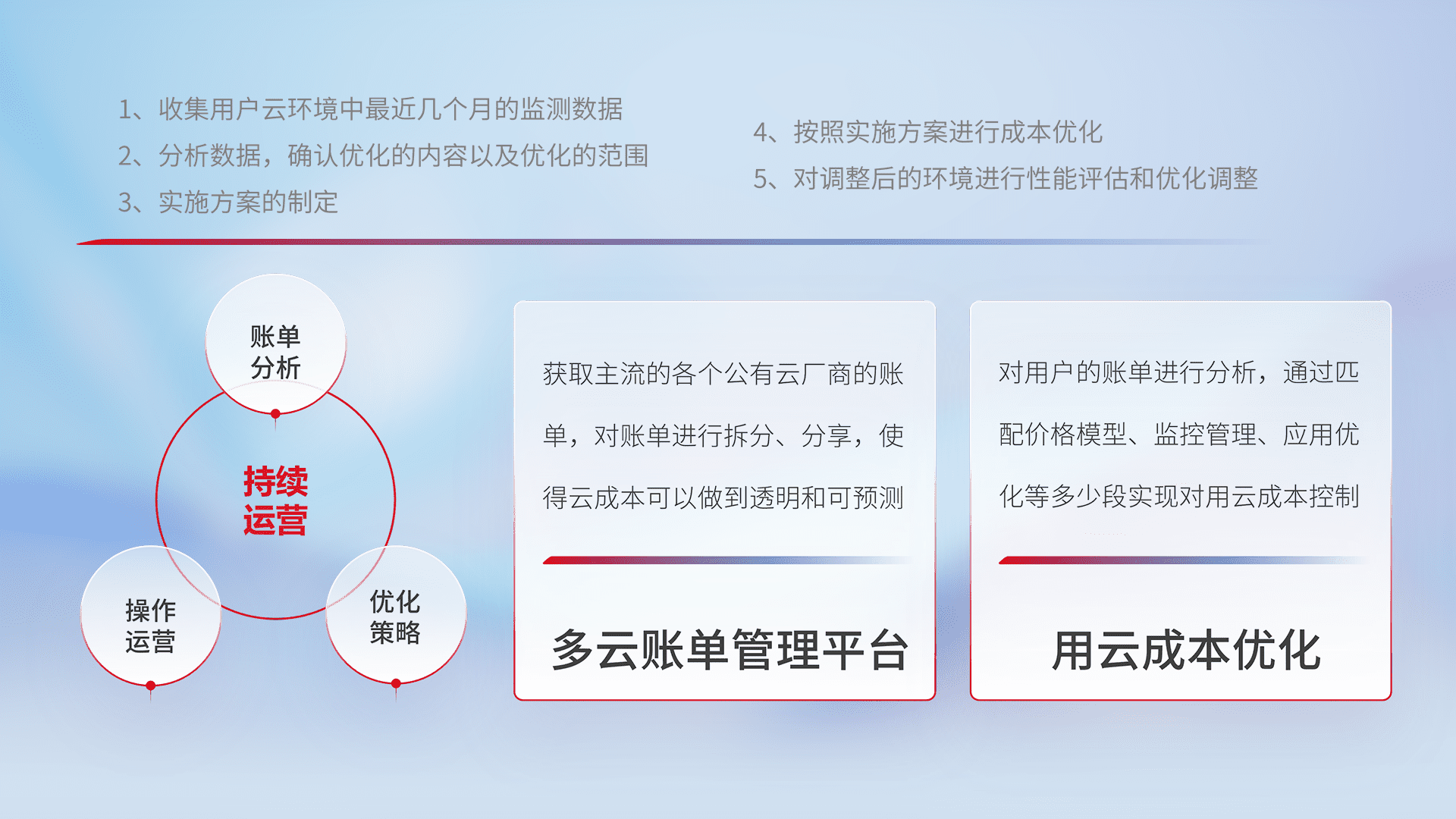 通过多云纳管,,以统一的资源数据模型把客户的云资源进行抽象和封装,,,进而实现对多云资源的统一操作,,,,保障云资源管理的可靠性、、、、稳定性与可用性。。。量身定制化运维内容,,配置、、、、开发运维、、补丁管理、、、、备份、、、、监控、、、、认证和访问管理、、、审计和日常巡检等,,保障在用云过程中的可靠度,,,稳定度以及高可用率。。。